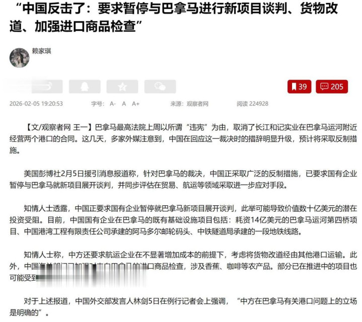 作为一个小国家,巴拿马本身在理亏的情况下还敢驳斥中国,这背后显然是有人撑腰。对此我国也不再只是外交警告,而是采取实质性的反制措施,这包括:要求国企暂停与巴方的新项目谈判、加强对巴拿马输华商品的检查,以及中国货轮在成本可控范围内绕行巴拿马运河。 与此同时,李嘉诚也开始发力,长和集团将巴拿马政府告上了国际仲裁庭,毕竟近30年时间里,长和集团对两座港口投资18亿美元,将其打造成吞吐巴拿马运河40%货运量的核心枢纽,没有任何理由的贸然收回,并安排丹麦航运公司强行接管,泥人都还有三分火气呢,巴拿马这样欺人太甚显然不会就这么算了。