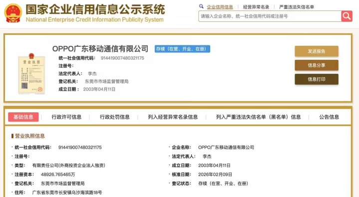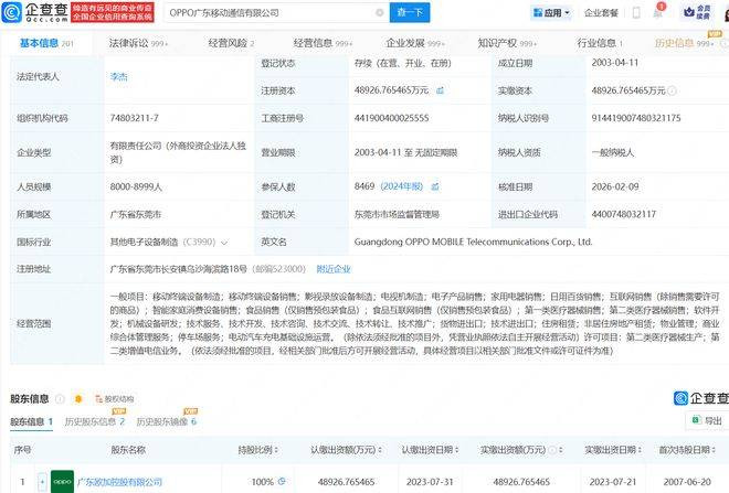 {jz:field.toptypename/}凭证日前国度企业信用信息公示系统流露,OPPO广东移动通讯有限公司发生工商变更,李杰接替段要辉成为OPPO广东移动通讯有限公司的法定代表东谈主,并同期担任司理及董事职务。公开信息流露,OPPO广东移动通讯有限公司设立于2003年4月,开云体育下载注册老本约4.9亿东谈主民币,狡计限制包括移动末端斥地制造、移动末端斥地销售、影视录放斥地制造、电视机制造等。鼓舞信息流露,该公司由广东欧加控股有限公司全资合手股。