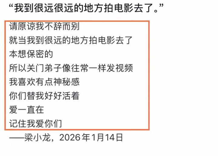 在阅读此文前,诚邀您点击一下“关注”,方便您下次继续阅读相关文章,您的认真阅读是我们最大的动力。 梁小龙走后最让人不舒服的,不是噩耗本身,而是人都不在了,账号还在按时更新,还用一种“我去很远的地方拍电影”的说法跟粉丝告别,把离开写得像一次出工,把生死写得像一段行程,很多人看完那一段字只觉得心口发紧,因为那条动态标着日期,写的是2026年1月14日。