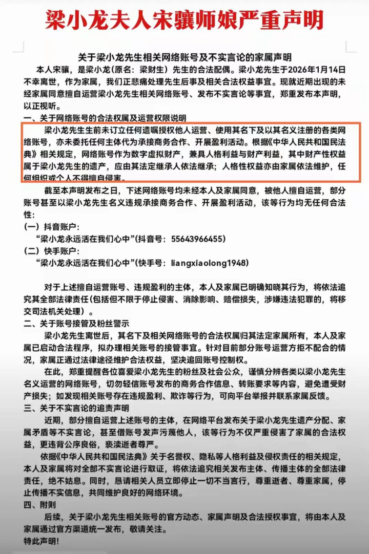 但家属后来把话说得更直,宋骧公开发严正声明,点名这些账号并没有得到梁小龙生前授权,也没有遗嘱授权任何人去运营、去使用他名下或以他名义注册的网络账号,更没有委托谁去接商务合作、去做盈利活动,意思很清楚,人走了,名也不能被人拿去当生意做。
