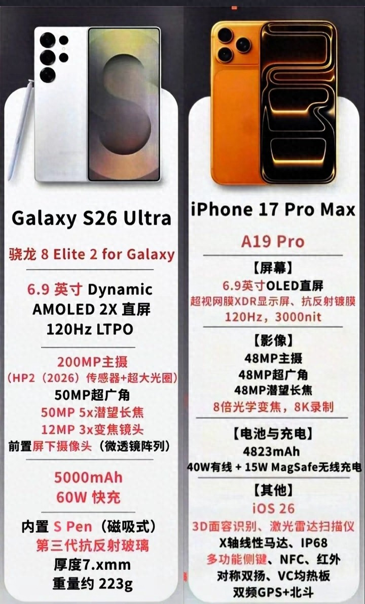 1:2026年智高手机市集的竞争插足尖锐化阶段,三星与苹果两大巨头再次在旗舰机型上伸开正面交锋,三星Galaxy S26 Ultra与iPhone 17 Pro Max的参数对比激发普通关心,两款确立在性能、影像、屏幕等中枢规模均展现出顶尖水准,但令东谈主恐怕的是,它们的电板容量均未冲破5000mAh大关,这一细节成为行业扣问的焦点。