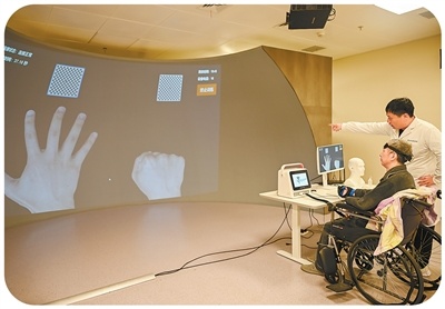 4月7日,贵州省贵阳市,北京积水潭病院贵州病院医师在率领患者进行脑机接口康复西席。 袁福洪摄(影像中国)