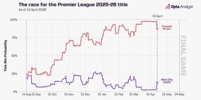 体坛周报全媒体报说念 英超领头羊依然是阿森纳,但联赛冠军似乎照旧被公论划给了少赛一场过时6分的曼城——在上周末枪手1比2输给伯恩茅斯,而蓝月则3比0干净利落地痛击切尔西之后,大部分旁不雅者的主见似乎齐是如斯。阿尔特塔的球队士气齐崩了,这边瓜迪奥拉带队却阵容如虹,那终了终末手艺的逆转不是分分钟? 但简直会这么吗?阿森纳照旧万劫不复守擂灰心?在38轮联赛还剩下至少6轮的情况下,提前盖棺定论仍有可能出错。“阿森纳还有上风”,这种说法也依然可以找到表面依据。日前Opta就胪列了五大事理,讲明枪手“无须慌乱仍可保捏乐不雅”。天然了,数据有时辰是会骗东说念主的,而能不可把这些数据升沉为我方的奖杯,那就要看枪手的意识和造化了。